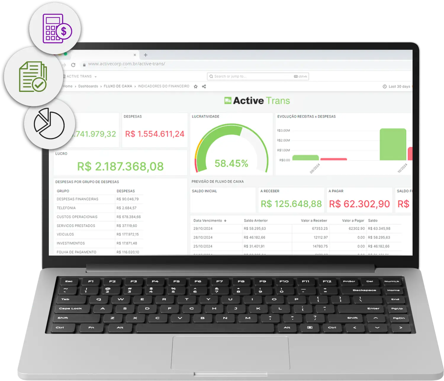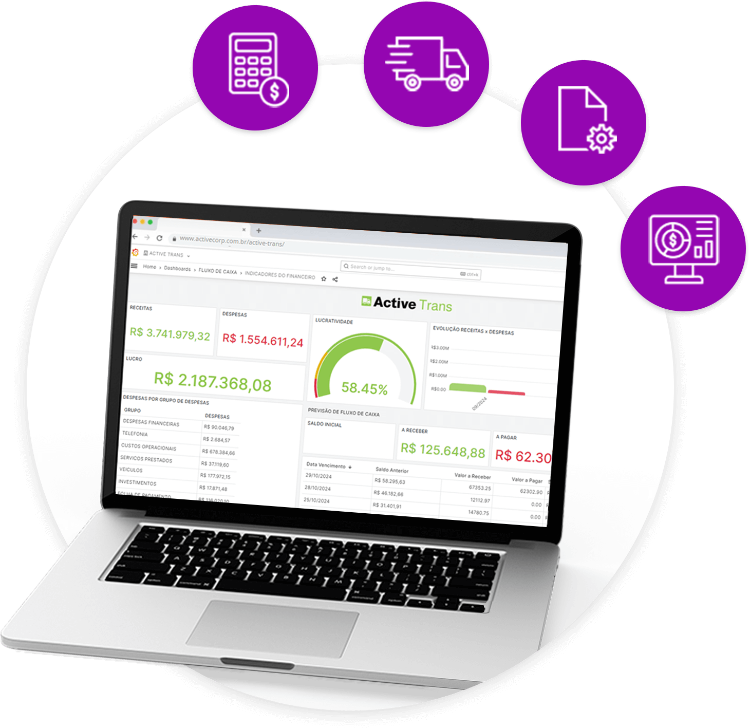 Com a Active Trans você tem controle total da sua transportadora: acompanhe custos, receitas e entregas em tempo real e descubra como aumentar a lucratividade do seu negócio.